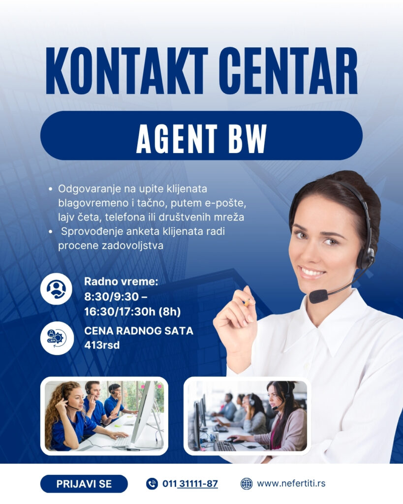Voliš da komuniciraš sa ljudima i želiš da iskoristiš svoje znanje engleskog jezika?Ova pozicija ti pruža priliku da radiš u dinamičnom okruženju gde je akcenat na pružanju informacija i profesionalnoj komunikaciji sa klijentima. Poseban značaj stavlja se na kvalitetnu komunikaciju, jasno prenošenje informacija i stvaranje prijatnog iskustva za svakog klijenta.Tvoja zaduženja će uključivati:• Upravljanje i odgovaranje na sve pozive i upite klijenata• Davanje preciznih i jasnih odgovora klijentima ili prosleđivanje njihovog upita odgovarajućem timu koji može obezbediti najbolje rešenje• Pružanje pojašnjenja klijentima za slučajeve zahteva za pružanjem usluge i više informacija o istima• Dokumentovanje svih informacija o pozivima u skladu sa standardnim procedurama u radu• Odgovaranje na e-mail poruke klijenata u roku od 24 časa• Prikupljanje povratnih informacija od klijenataKontakt centar agent poseduje:• Odlično izražavanje na srpskom i engleskom jeziku, u pisanoj i usmenoj komunikaciji• Poznavanje rada na računaru i i spremnost da se nauče novi alati• Sposobnost praćenja jasno definisanih procedura i radnih uputstava• Učtivost, ljubaznost i uslužnost u postupanju sa klijentima u svakoj situacijiŠta nudimo:• Rad u dinamičnom timu koji neguje saradnju i uzajamnu podršku• Efikasnu obuku i kontinuiranu podršku u procesu prilagođavanja i integracije novih zaposlenih• Luksuznu kancelariju sa pogledom na reku Savu• Programe obuke i profesionalnog usavršavanja• Klizno radno vreme 8:30/9:30 – 16:30/17:30h (8h)• Satnica: 413 dinara• 5 radnih dana (uključujući vikende)