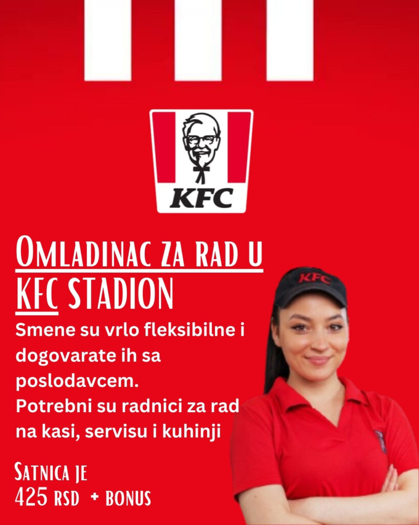 Za potrebe našeg klijenta trazimo punoletne(18-30 godina) vredne i odgovorne omladince za rad u KFC-u.
